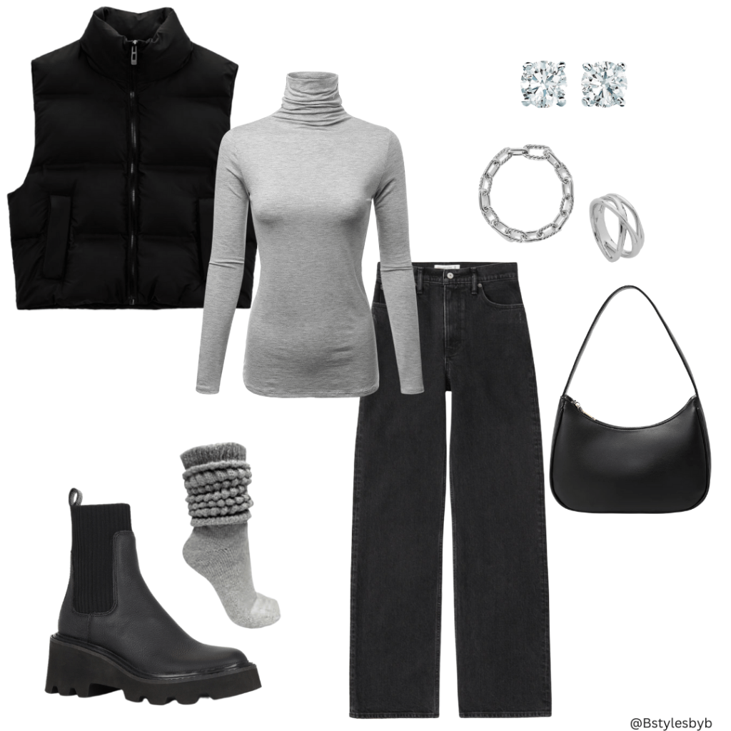 Another style edit coming your way! I’m really into vests this winter season. Whether they’re oversized or cropped mini’s, it’s an effortless addition to your outfit. I found this vest at Zara. I went back and forth on a few since they have a variety of options, but I believe I made the right choice with this one! I found this grey turtleneck on Amazon. It’s thin, stretchy and super soft – I decided to buy it in black and brown as well! I’ve been loving Abercrombie’s jeans lately – they fit my so perfectly. These are wide leg and have a slit on the back of the right thigh. My favorite black boots at the moment – pair perfectly with ankle or wide leg jeans. These slouch socks are so cozy, they remind me of the socks my mother wore when I was a kid. This black shoulder purse is simple and the perfect size. Its sleek and doesn’t take away from the outfit. The jewelry I paired with this style is a little on the pricey side, but I found some shoes on Amazon and linked them below!