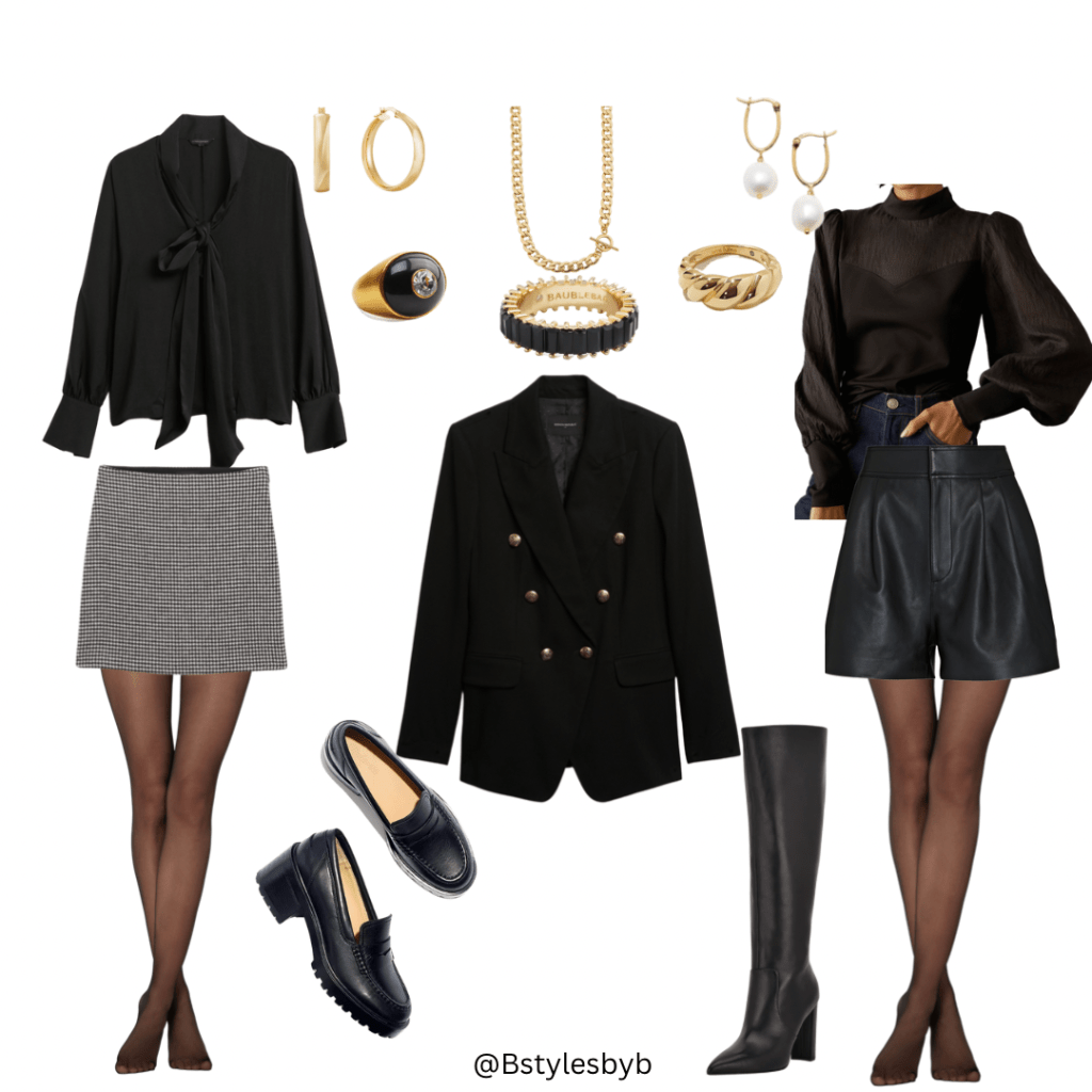 And we’re back with another style edit! This post is dedicated to holiday style and/or party looks. Whether you’re having a date night, getting drinks with the ladies, or attending a holiday party, these styles are perfect for any special occasion. Neutral colors (especially black and darker colors) are my go-to/comfort colors. I paired both outfits with a black blouse and sheer tights. The jewelry pieces are interchangeable with each outfit. They are also great pieces that can be staples in your jewelry collection. I love the look of this black captains blazer with gold button detail – another necessity as it can be dressed up or down. Links to these items below! **Some links have been changed to similar items due to product availability.