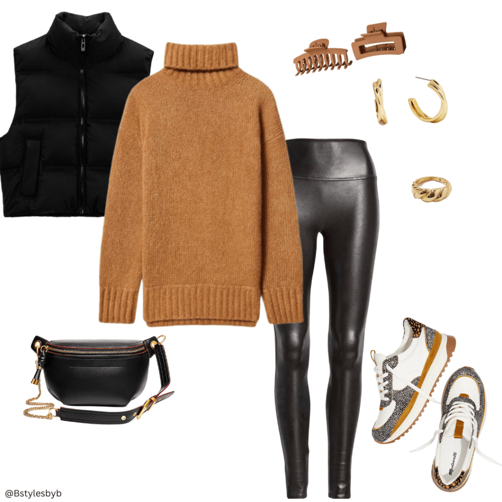 Happy Wednesday y’all! Here with another outfit of the day – casual look! I just bought these Madewell sneakers – I think they are so unique and add a little flair to my wardrobe. I actually saw someone wearing these on a sailboat tour in Rhode Island and of course asked where they were from. After being sold out in my size for months I finally snagged them. I paired these sneakers with my Spanx leather looking leggings and this cozy Everlane sweater. I found this leather crossbody on Amazon! I finished off the look with my Zara mini puffer vest, Uncommon James jewelry and these Amazon hair clips.